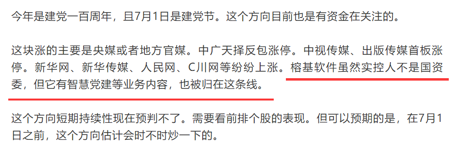 再就是建党百周年概念。阿7是一直觉得榕基软件能涨的,说过两次。周五终于在中广天择连续上涨刺激下涨停了。榕基软件这个票是低位启动的,阿7认为它后面空间应该不会只有这一个涨停。