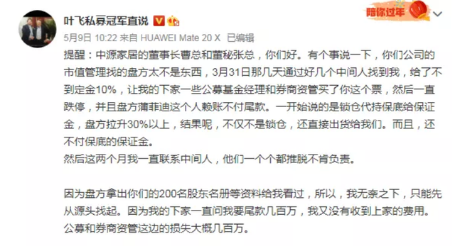 最近几天一个叫叶飞的昔日私募冠军,也自爆了。起因是他被黑吃黑了。
