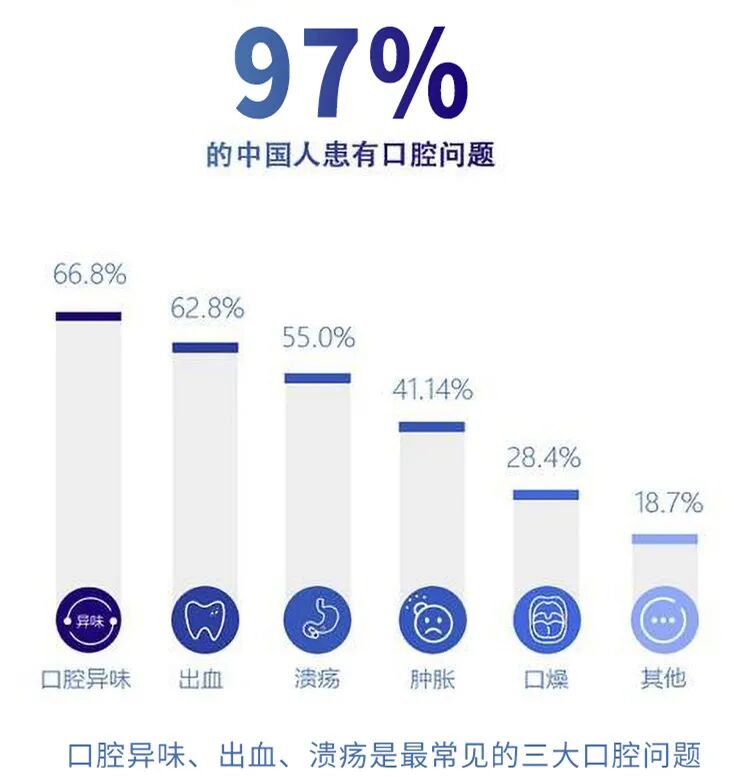 且调查数据显示:高达 97%的成年人正在遭受不同程度的口腔问题困扰! 口腔 异味、出血、溃疡 成为最常见的三大口腔问题!*以上数据来源于《第三次全国口腔健康流行病学》