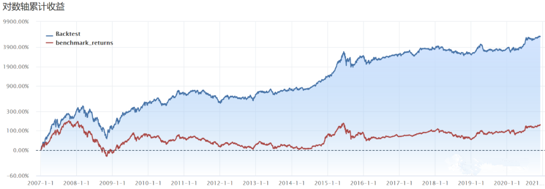 而我自己坚持做量化的原因很简单, 量化交易的收益和风险都可以比较明确地预期。 为了更清楚地看到2015年以前的表现,使用对数轴收益曲线,如下。 能看到主要是2008年有比较大回撤,但是很快回血。