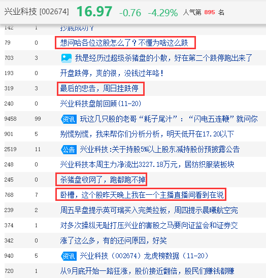 从公开信息看,兴业科技为国内牛头层鞋面革龙头,市场占有率连续多年国内排名第一;第三季度净利润同比增长74.6%,内外部经营环境未发生重大变化。股吧中有人讨论称,兴业科技或遭遇杀猪盘。也有财经大V表示,兴业科技走势像庄股崩盘。