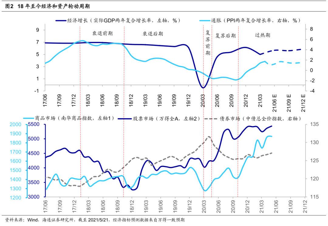 今年的投资时钟定位:过热期。 如果单纯的看表观增速,今年GDP四个季度或逐季下降,PPI二季度或是全年高点,于是按照传统的投资时钟看,21Q1是过热期,Q2滞胀期,Q3衰退期。然而实际上宏观环境不可能一季度一大变,表观增速大幅波动只是因为同比数据会受到低基数的扰动。因此我们对今年宏观经济的判断还是要剔除掉基数的影响,即看两年年化增速。本轮投资时钟从2018年的2月开始,期间先后经历了衰退(18/02-20/03,标志是政策转向)和复苏(20/03-20/10,标志先是经济上行,后是PPI上行),去年10月至今(截止2021/5/21,下同)已经轮动到流动性边际收紧(社融、M2增速去年10月后开始向下)+基本面向上+通胀向上的过热期(阶段⑤)。展望今年,一季度GDP两年年化增速为5.0%,基于万得一致预期的GDP单季度两年年化增速在剩下三个季度分别为5.7%、5.6%和5.9%,全年GDP增速略向上;而PPI当月同比虽然在4月大幅抬升,但剔除去年低基数影响后的两年年化增速仅为1.7%,根据万得一致预期下半年PPI两年年化后的单月同比增速将基本维持在1.4%左右,通胀压力并不大。因此综合来看今年宏观环境依旧处在去年10月以来的过热期,股票市场还有机会。