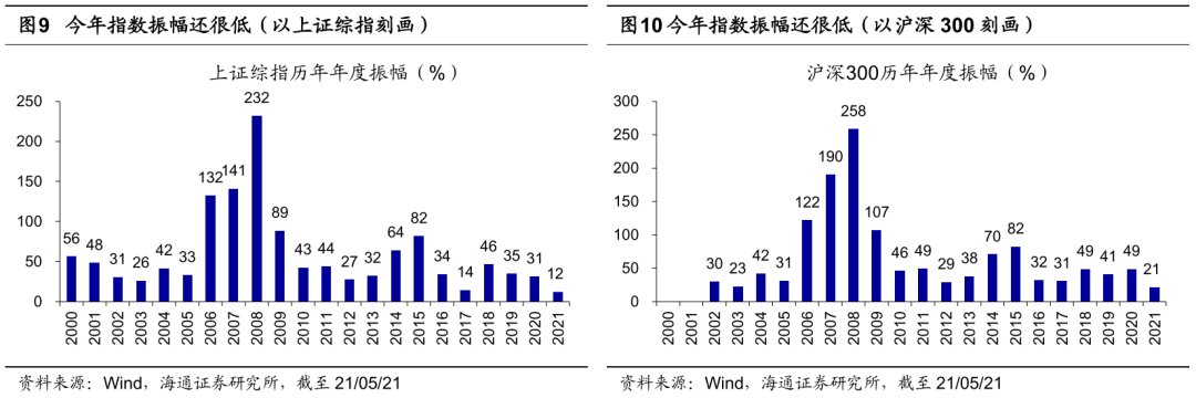 参考历史年度振幅,今年指数再创新高概率偏大。 统计A股各主要股指在2000-2020年间每一年的振幅(年内最高价相对最低价的涨幅),上证综指2000年以来年振幅基本都在25%以上,在大牛市或熊市的时候指数的振幅会更高,年振幅平均为61%(中位数43%),其中仅2017年振幅小于25%,只有14%,主因这一年市场结构性特征明显,以上证50为代表的价值股全年涨幅25%,而以创业板指为代表的成长股全年下跌-11%。今年至今(截至20210521,下同)上证综指振幅只有12%,比2017年还小。如果用沪深300指数衡量,2002年沪深300设立以来年振幅大部分时间在30%以上,平均振幅为69%,中位数46%,但今年只有21%;如果用万得全A衡量,2000-2020年间指数年振幅大部分时间也在30%以上,平均70%,中位数45%,但今年只有15%。今年上证综指的低点是3月9日的3328点,沪深300在3月25日的4883点,万得全A在3月9日的5071点,如果前期低点有效,那参考历史股指的波动幅度,今年股市还有进一步向上拓宽的空间。我们认为,前期低点是有效低点的概率较大,2月18日之后的下跌反映了市场对通胀上行、货币政策收紧等担忧,目前看,最悲观的预期可能正在过去。