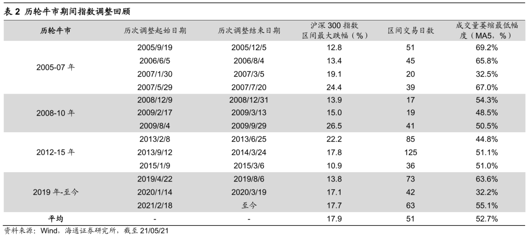 此外,过去每轮牛市中都有3-4次耗时1个月以上、跌幅15%附近的大调整。本轮调整从2月18日至今历时63个交易日、最大跌幅17.7%(以沪深300刻画),成交量(MA5)最低萎缩至前期高点的55%,从时间和空间上看这次调整已经较为充分了。