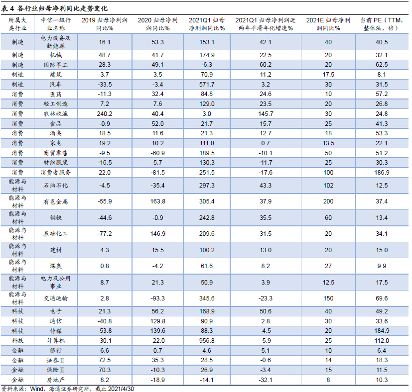 两年复合增速角度, 21Q1 制造、科技增速高。 从大类行业看,21Q1/20Q4金融归母净利累计同比为7%/-1%,制造为137%/19%,消费为65%/12%,科技为171%/68%,能源与材料为620%/-9%,所有大类行业业绩都大幅改善。从单季度同比角度看,大部分行业盈利增速均有大幅改善,这是因为去年初新冠疫情爆发导致的低基数所致,所以为了更客观对比各行业业绩增速变化,我们可以从归母净利润近两年平滑年化增速角度来分析。从大类行业看,21Q1/20Q4金融归母净利近两年年化复合累计同比为1.4%/6.7%,制造为19.7%/12.9%,消费为16.1%/11.9%,科技为19.8%/43.7%,能源与材料为12.7%/-10.0%,相对而言制造、科技增速高。进一步从中信一级行业看,21Q1两年年化增速较高的行业是电子、电力设备及新能源、有色金属、钢铁、基础化工、石化和医药。