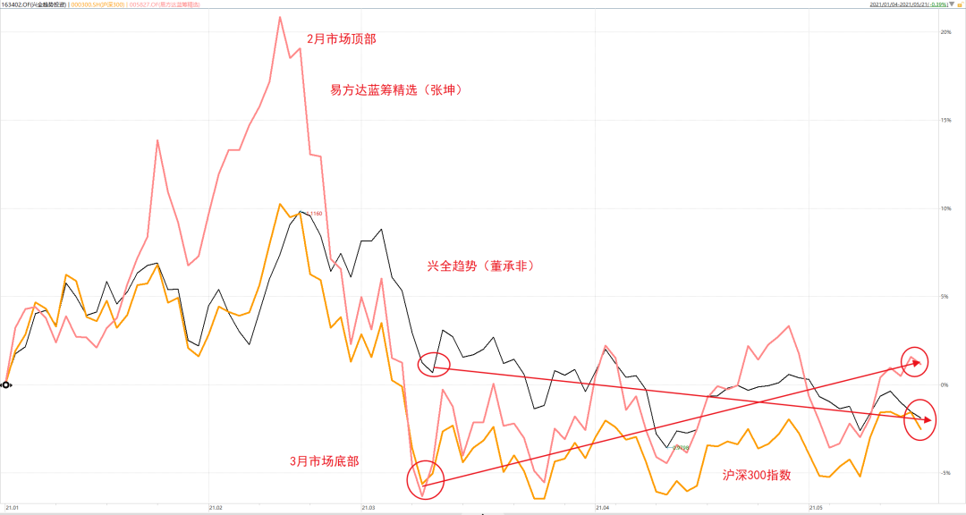 但3月初市场见底后,易方达蓝筹精选基金反弹了6%,而兴全趋势继续下跌了4%,最终黑色线(兴全趋势)又跌到了红色线(易方达蓝筹)下方,跟橙色线(沪深300指数)很接近。