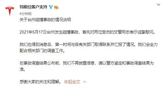 5月18日上午,特斯拉发布关于台州碰撞事故的情况说明, 称对两位受伤的交警同志表示诚挚慰问,并表示事故调查结果公布前,不再披露信息。