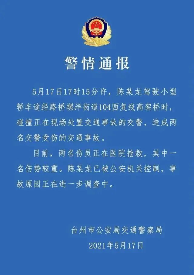 17日晚间,浙江省台州市公安局交通警察局官方微博发布通报称,5月17日17时15分许,陈某龙驾驶小型轿车途经路桥螺洋街道104西复线高架桥时,碰撞正在现场处置交通事故的交警, 造成两名交警受伤的交通事故 。