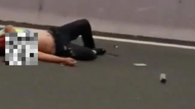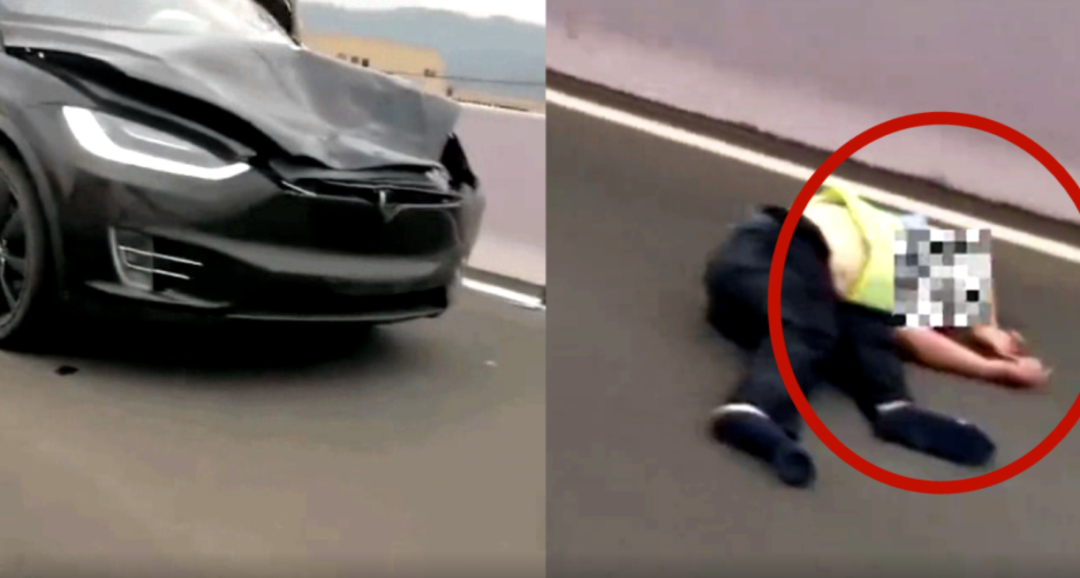 事故视频显示, 高架桥两名交警倒在地上,一辆黑色特斯拉轿车车头受损 。