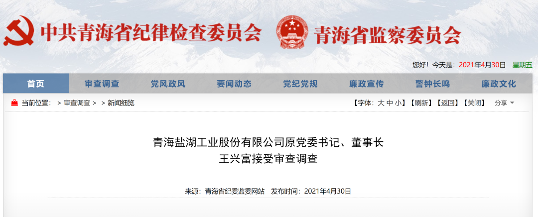 据青海省纪委4月30日消息, 青海盐湖工业股份有限公司原党委书记、董事长王兴富涉嫌严重违纪违法,目前正接受省纪委监委纪律审查和监察调查 。