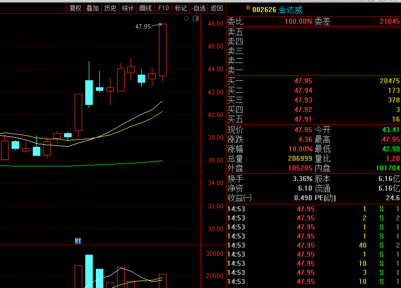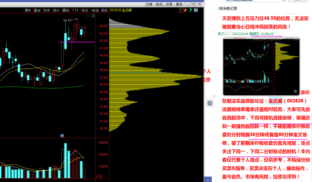 而上周五选得跨周股,:金达威(002626) ,今天开盘分析下探后没破前期支撑,今天里面突破上方压力封涨停,上周五我都明确讲到,要重点个关注本周一、本周二分时低吸的机会,按照上午的策略,今天开盘分时下探30分钟交出金叉低吸,这个涨停板是稳稳的把握到了!由于市场是无法提前预测的,我并不能百分之百确定这票本周一会涨停,因此这票今天涨停,本周二就不要追高了!
