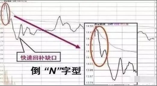 开盘后股价稍有上冲后就快速回落,随即又有上冲动作,但上冲的高度超不过开盘价随即回落,形成一个倒“N”字型走势——说明主力高开是为了吸引跟风盘进行出货,显示空头力道强大,当日看跌。如下图: