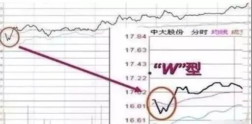 B.“W”型走势:与“N”型走势类似——只是多了一次探底,在分时形态上形成一个“W”型走势。如下图: