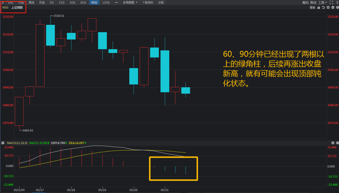 60、90分钟已经出现了两根以上的绿角柱,如果后续再涨出收盘新高,就有可能出现顶部钝化状态。