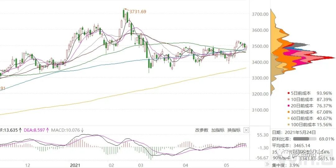 上图是上证日K线图,北上资金流入18亿,期货贴水29点,汇率6.4一线纠结,融资融券流出24亿,三月社融数据转向,四月直接腰斩,但走势解读是未来降速空间压缩,MACD出第7根红柱,有所收窄,CCI+41,等待转折。