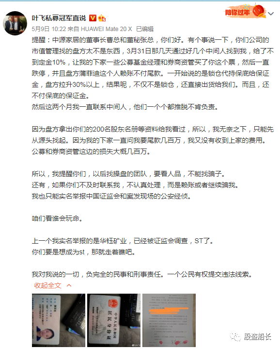 此后两日,该股连续跌停,券商资管出于风控要求,平仓止损。相关人员也已经离职或停职。而叶飞恼羞成怒,不甘心被黑吃黑,在商讨无果之后,一起下地狱,反正他也没啥可以再损失的,遂微博讨要约定未付的6.5%,大概八十万元左右代持费。