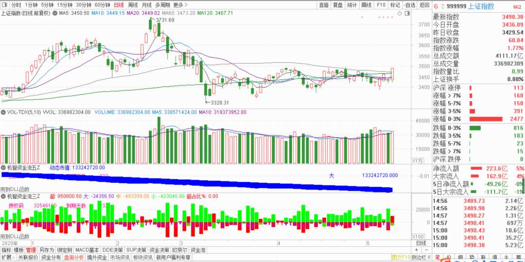 今日超大单资金流入20亿,大单资金流出1.3亿,中单资金流出9亿,散户资金流出10亿。主力资金今日呈净流入状态,指数出现小幅上涨,机智资金流五号为蓝色,说明目前暂无主力资金场内持仓,后续可密切关注资金流入情况。