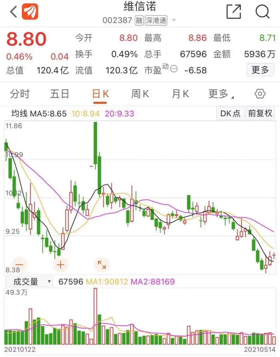 据悉,维信诺的盘方主要由一个叫“曾波”的人负责,而此人正是维信诺和华夏幸福实际控制人王文学的老乡。 2020年10月底至11月初,股价从最低12.75元/股,拉升至14.75元/股。“原定是要拉到16元抛的,套现方也不等了,于14块钱就开始往下砸,所以股价从11月中旬开始一路向北。 ”截至5月14日收盘,维信诺股价收于8.80元/股。