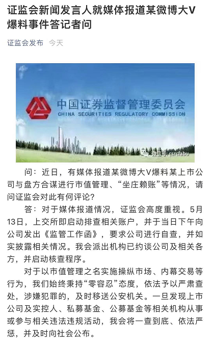 证监会5月14日回应称,对于媒体报道情况,证监会高度重视。5月13日,上交所即启动排查相关账户,并于当日下午向公司发出《监管工作函》,要求公司进行自查,并如实披露相关情况。证监会派出机构已约谈公司及相关各方,并启动核查程序。