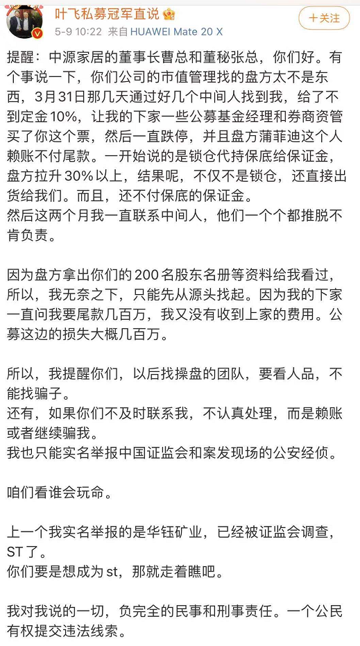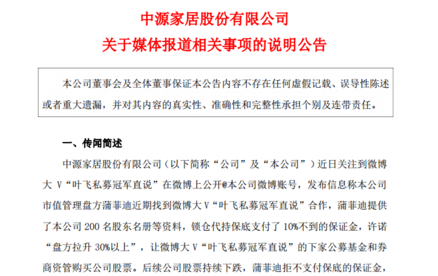 针对叶飞所言,5月13日晚间,中源家居就该传闻发布公告逐条澄清,称公司从未委托盘方开展“市值管理”,与叶飞及所谓盘方人士也并不相识。