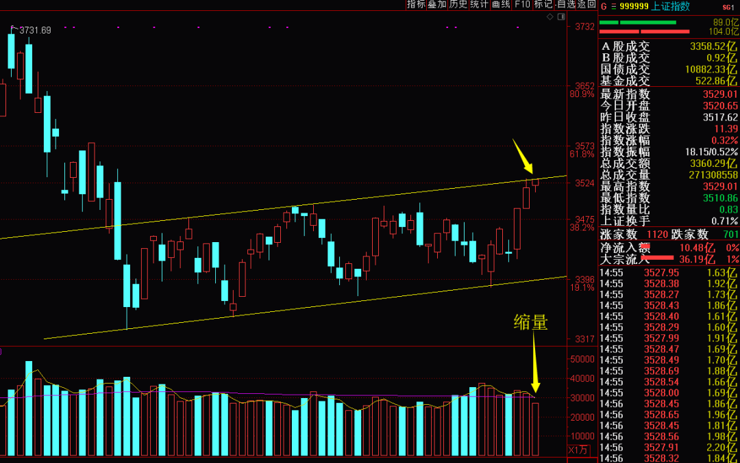 看图,大盘缩量收小阳线,压力线还是没过去,量也不够。