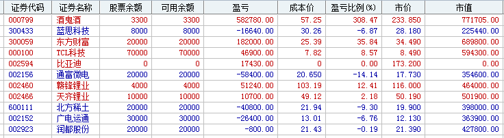 刺客持仓: 酒鬼酒、蓝思科技、东方财富、TCL科技、通富微电、赣锋锂业、天齐锂业、北方稀土、广电运通、润都股份