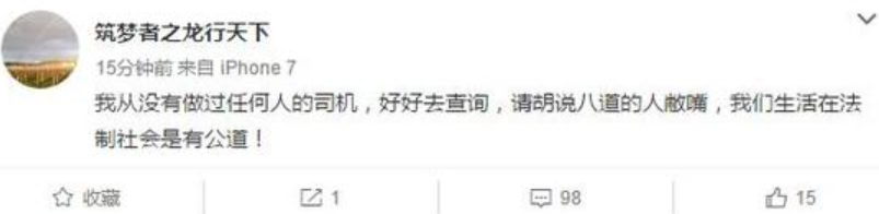 “我从没有做过任何人的司机,好好去查询,请胡说八道的人 敝嘴 ,我们生活在法制社会是有公道!”