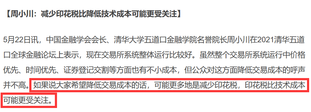 这个话里面,领导重点聊的是交易系统,现在的股票交易系统还有不少成本,但是散户对这些成本不在乎。此时, 领导的意思是,如果要节约交易成本的话,还不如减少印花税,效果更好。 你看看这些用词,如果,可能,更受关注, 根本就没有要降低印花税的意思。