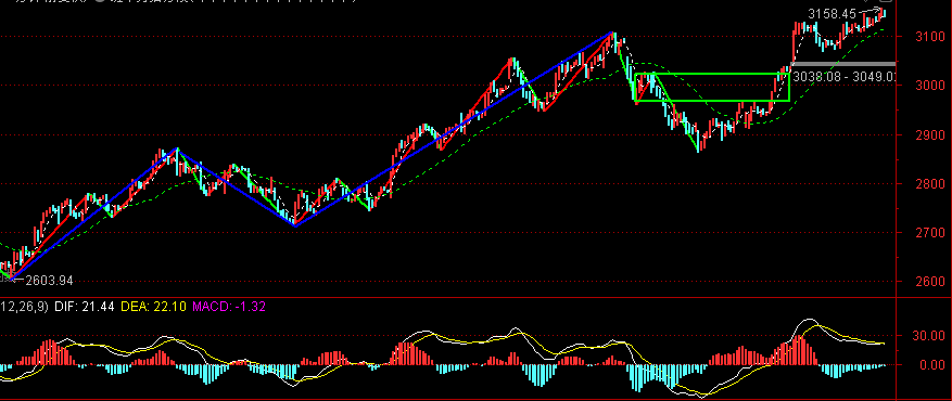 上证30分钟K线图中MA5均线在MA30均线下方(MA5为白色虚线,MA30为绿色虚线),MACD在0轴上方绿柱区,处于买点区。指数在上涨压力线附近遇阻缓慢回落,预计还有小幅震荡,极大概率在下方黄色线附近止跌后再上突破上涨压力线继续上涨,因此建议持仓待涨。