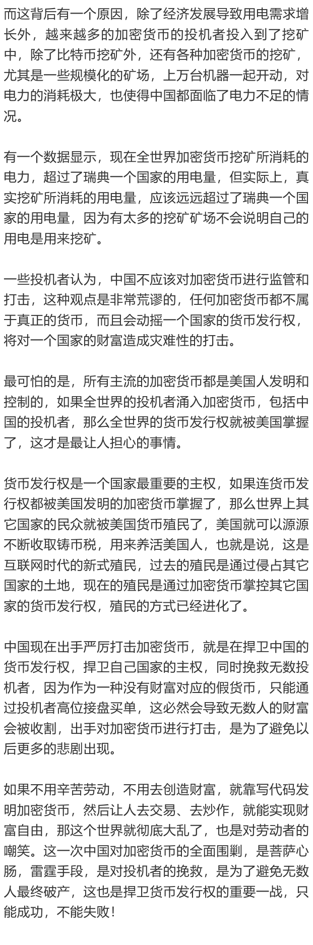 我之前多次分析过,真正的货币必须与财富对应,而加密货币不仅没有真实的财富对应,却还在消耗社会的财富,包括浪费电力,给社会带来了极大的负面影响。