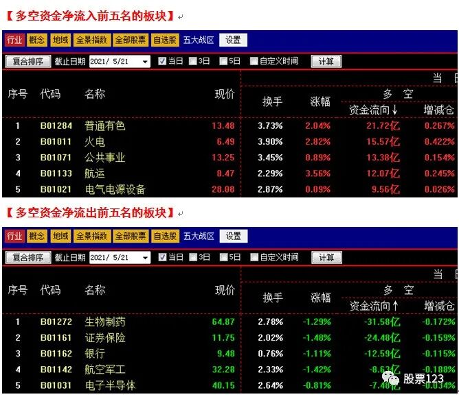 再看资金流出榜,生物制药板块引领做空,资金流出31.58亿;其次是证券保险板块,资金流出24.48亿;此外,银行板块、航空军工板块、电子半导体板块的资金流出额也都相对较多,分列资金流出榜第三到第五名位置。