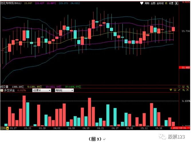 今日两市涨幅超过3%的个股536只,其中涨幅在9.9%以上的个股73只;跌幅超过3%的个股248只,其中跌幅在9.9%以上的个股10只。图3所示为指南针特有的0Z指数K线图,从图中可以看到,今日0Z指数收出阳线,收盘位置不仅站到了优化布林上紫线的上方,而且距离5月14日的收盘位置也已尽在咫尺,这说明市场整体走势相对较强,场内多数中小盘个股的短期调整已有结束迹象,后市继续震荡上行的可能性较大。