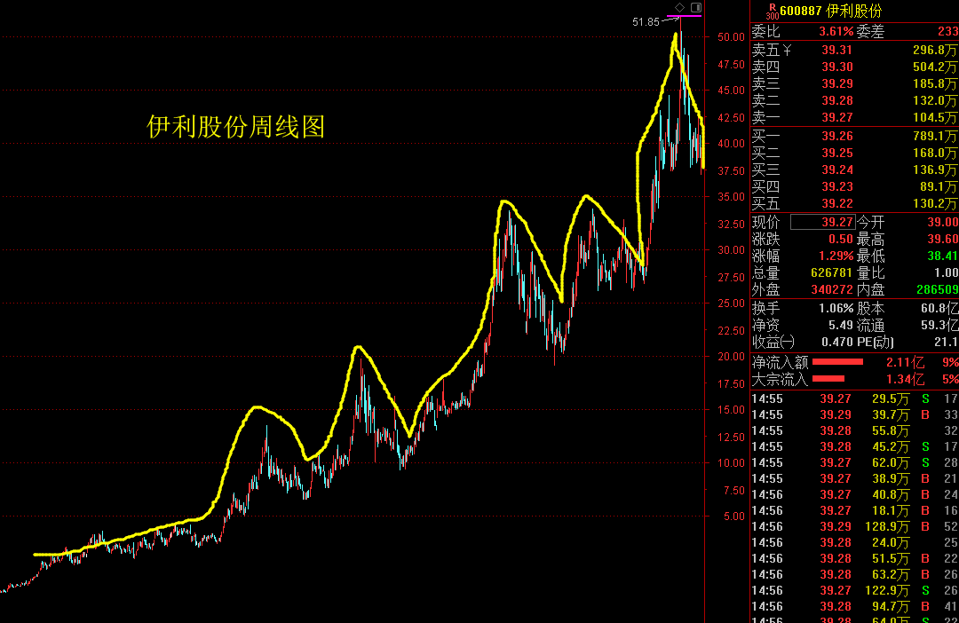 上边是伊利股份的周线图,看得出来,此股就是一只慢牛股,上涨 — 调整 — 上涨 — 调整……,就这样不断新高的过程。