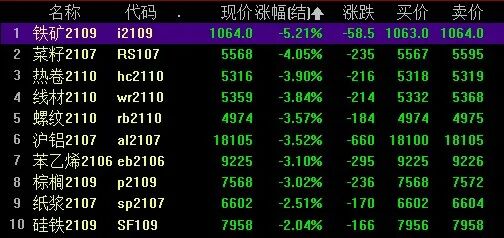 截至收盘,铁矿石2109下跌5.21%,热卷2110下跌3.9%,螺纹2110下跌3.57%。