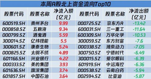 本周“白酒双雄”贵州茅台、五粮液重获北上资金青睐,本周分别获净买入9.99亿元、9.34亿元。京东方A、三一重工、万华化学等遭北向资金卖出居前。