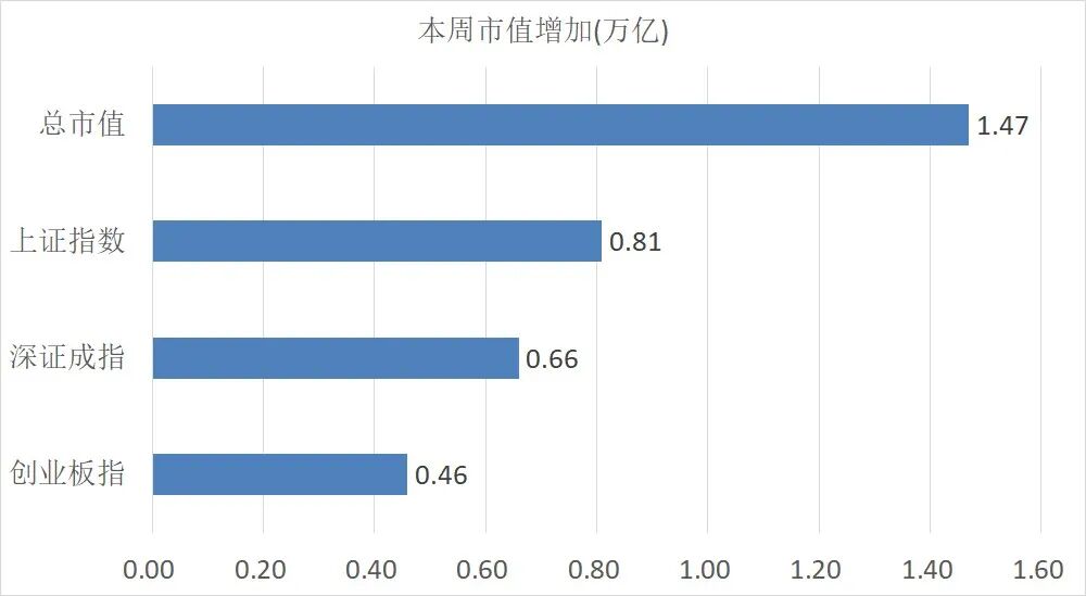 本周两市市值增加了1.47万亿,其中上证指数市值增加了0.81万亿,深证成指市值增加了0.66万亿。(注:总市值=上证指数+深证成指)