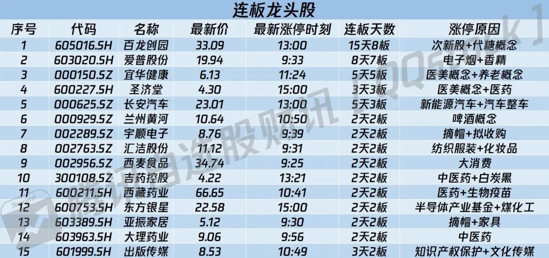 今日个股呈普涨格局,且逾百股涨超9%。连板强势股方面,百龙创园上演15天8板走势,爱普股份上演8天7板走势,宜华健康上演5连板走势,圣济堂上演3连板走势。