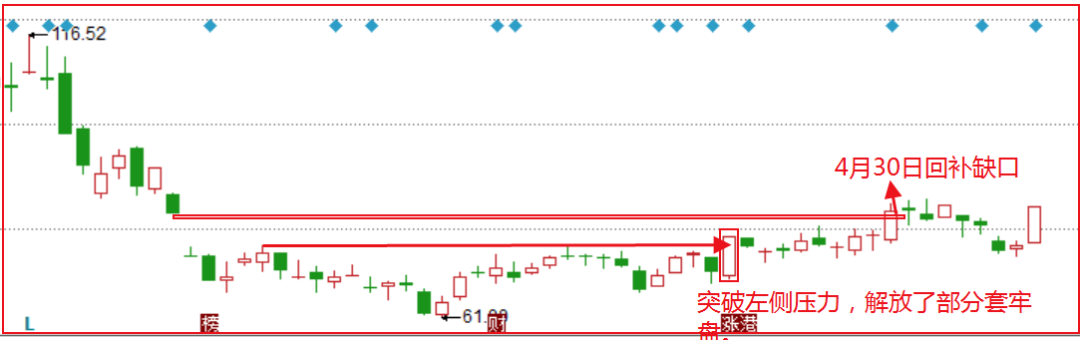 且4月30日那根放量的阳线,刚好回补了3月5日跳空向下的缺口,说明资金接下来很有可能会发起冲击。