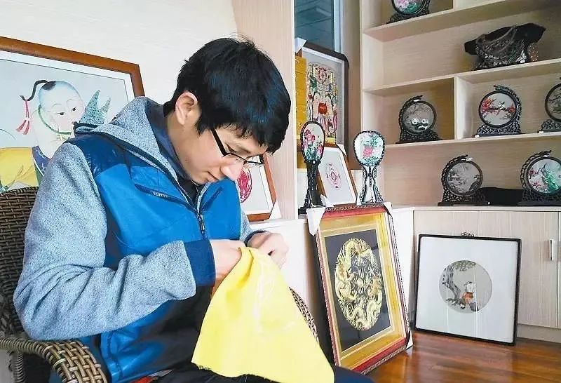 只有初中二年级文化水平的他自学了《图形设计软件自学教程》,几分钟就能设计好一把精美的扇面。他的很多设计,中心都绣成了产品。