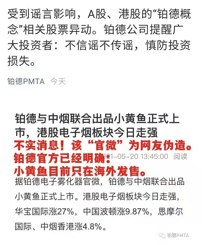 5月20日,有铂德PMTA的微信公众号宣布,铂德与中烟联合出品的小黄鱼电子烟正式上市,由此引发了一众股价的暴涨。