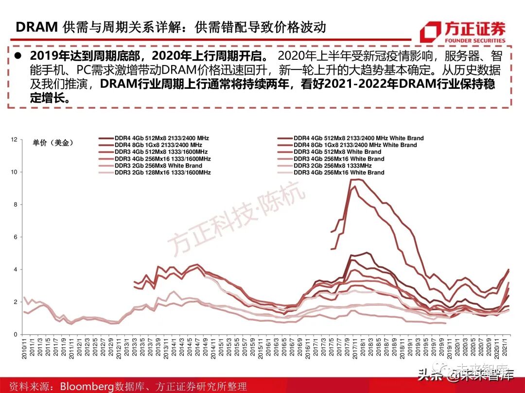 DRAM行业:周期性强,一个周期约为四年。由Bloomberg提供的各型号DDR3/4单价波动来看,2012年至 2016年,2016年至2020年分别为完整的波动周期。DRAM扩产从计划至出货约为两年,故可得一个周期 中价格上行下行分别约两年的原因为:供小于求,价格上行,厂商扩产,供大于求,价格下行。