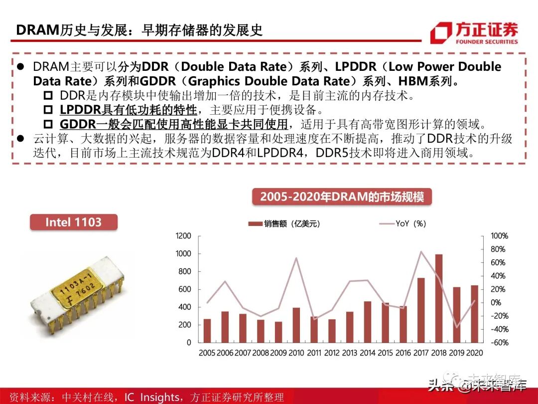 1970年,Intel公司推出第一款商用DRAM芯片Intel 1103,彻底颠覆了磁存储技术。DRAM的出现解决 了磁芯存储器体积庞大,运行速度慢,存储密度低及能耗较高等问题。