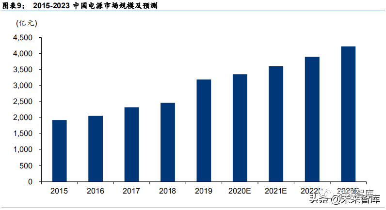 集成化和小型化是开关电源主要发展趋势。集成化可以使电源产品更加紧凑,减少引线长 度,降低寄生参数,提高系统可靠性。在航空、航天、军工领域,小型化和轻型化得电源 产品能够减轻起飞及飞行重量,增大关键人物功能单元空间,在航空、航天领域整机产品 严苛得体积、重量设计及参数分配中占有优势。在车载及新能源汽车领域,电源小型化和 轻型化可以降低启动和形式重量,增大有效车内空间。目前开关电源已完成电路板层面得 继承,更为集成得电源芯片使行业发展的方向。中国模块电源市场规模稳步增长。模块电源利用先进的工艺和封装技术制造,形成一个结 构紧凑、体积小、高可靠性的电子稳压电源,是可以直接安装(主要为焊接)在印刷电路 板上的电源变换器。开关电源模块是将开关电源上的分立元器件进行模块化封装,从而形 成体积更小、功率密度更高的模块电源,其内部电路也是开关电源。近年来,我国模块电 源市场需求呈现稳步上升的态势,但增速呈波动下降的趋势。据前瞻产业研究院发布的《中 国模块电源行业发展前景预测与投资战略规划分析报告》统计数据显示,2013 年中国模块 电源行业市场销售额为 39 亿元,同比增长 26.25%,2015 年中国模块电源行业市场销售额 突破 50 亿元,2018 年中国模块电源行业销售规模增长至 77.2 亿元,2014-2018 年复合增 长率为 14.6%。电源市场规模呈稳健增长态势,开关电源占比最高。根据智研咨询及中国电源学会数据, 2019 年中国电源市场整体规模约为 3200 亿元, 2023 年有望达到约 4200 亿元,年均复合 增长率约为 7.3%。从电源类型来看,电源市场结构近年发生改变,2015 年我国电源市场 中开关电源占比为 40%,2018 年对应比例上升为 58%。开关电源随着电子技术的提升, 在能耗、安全性等方面相较于传统线性电源具有优势,因而逐渐成为主流。