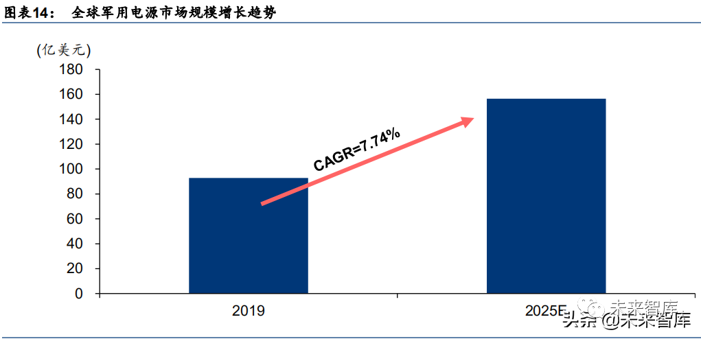 根据 Reportlinker 预测,到 2025 年底,全球下一 代军用电源市场规模有望从 2019 年的 92.9 亿美元增长到 156.5 亿美元, 2020-2025 年全球军用电源市场规模 CAGR 为 7.74%。