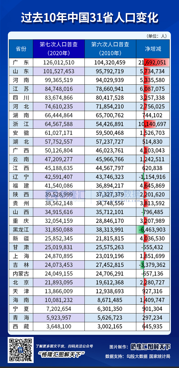 过去10年,人口净减少的省份一共6个,东三省全部入选,而且是唯一三个人口减少幅度都超过百万级别的省份,总减少数量超过1100万。
