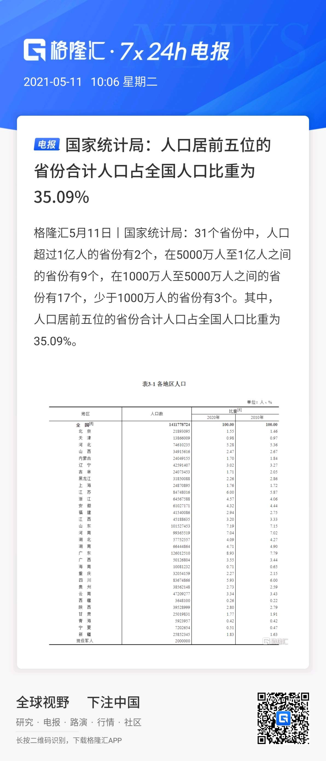1、人口总量: 总量低速增长。全国人口共141178万人,2010年的第六次普查数据增加7206万人,年平均增长率为0.53%。从年度看,实际上增速前高后低。意味着如果继续按当下趋势,下一个十年的增量会更少。当然随着如今放开生育成共识,未来出现回升未尝不可能。