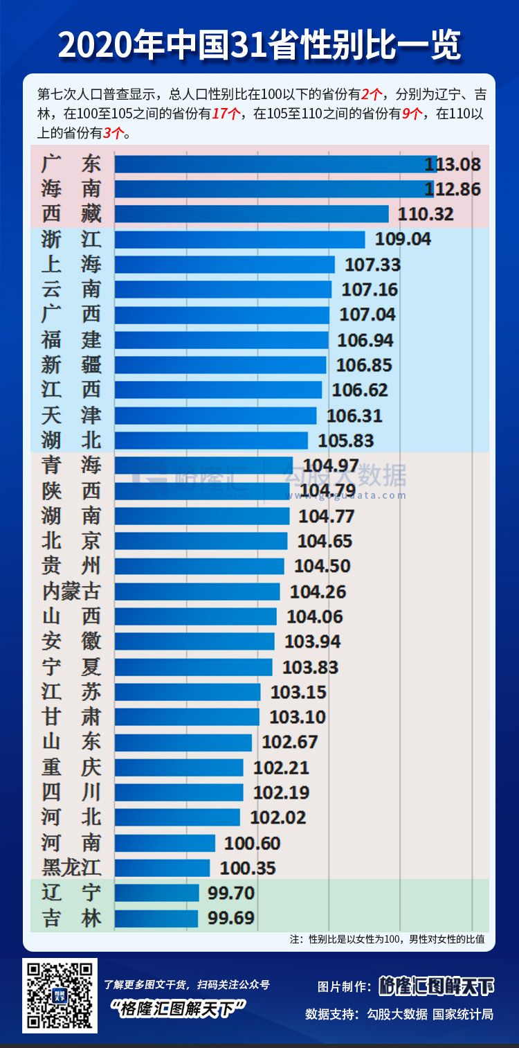 2、性别结构: 总比例105.07:100,算下来有3490万的“男光棍”。虽然比六普有所改善,但这个比例在全球仍属于高位,尤其农村地区失调更加突出。大城市虽然没那么突出,但年轻人都忙着去搞钱,生育率不高也是个问题。比例TOP3中,广东第一大家都理解,但后两位就比较出乎意料了。