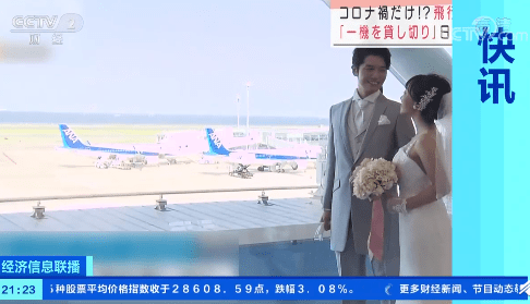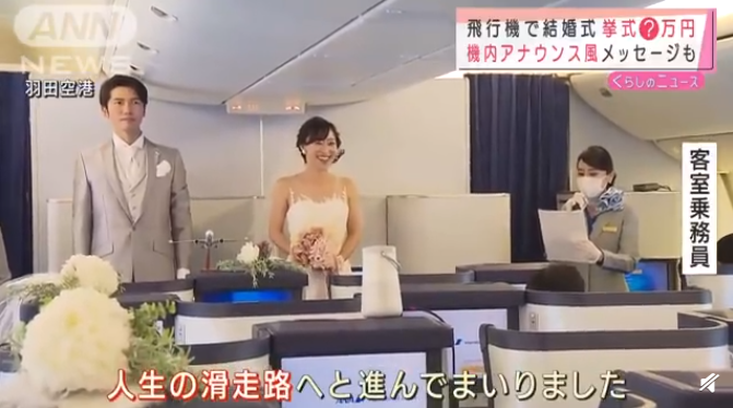 日本全日空航空和一家婚庆公司联合推出“机上婚礼”服务,现场有演奏,乘务员还用机内广播的形式献上祝福。