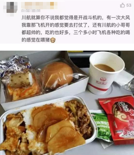 去年10月1号,泰国航空骄傲地宣布,他们推出的早餐业务每个月能带来约1000万泰铢(约合206万元人民币)的销售额,他们还打算让更多伙伴加盟售卖油条。 说起接地气,我国的四川航空公司也是王者级别。 川航的飞机餐一直远近闻名,网友形容为“喂猪航班”“从上机吃到下机”,以至于有乘客在飞机上看到抱着一筐土豆、准备开始投喂工作的空姐瑟瑟发抖。