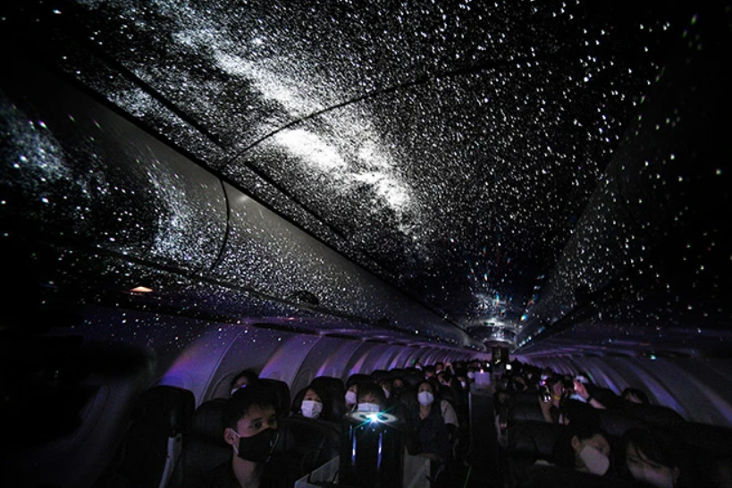 日本一家中型航空公司星悦航空,也推出了一个特别的航班:赏星游。 这也是一场颠覆认知的旅行。你以为是坐飞机上天,欣赏宇宙里的满天繁星,浪漫无比。 实际上,飞机起飞后,他们就会关闭所有灯,再打开6个球幕投影,在机舱顶部投影出星空和银河。